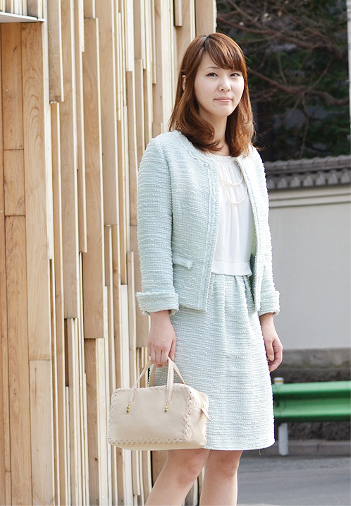爽やかなミントグリーンのコンビネーションワンピースは一枚で着てもエレガンスで華やか。フリンジ使いが華やかな女性らしいコンパクトなジャケットも。