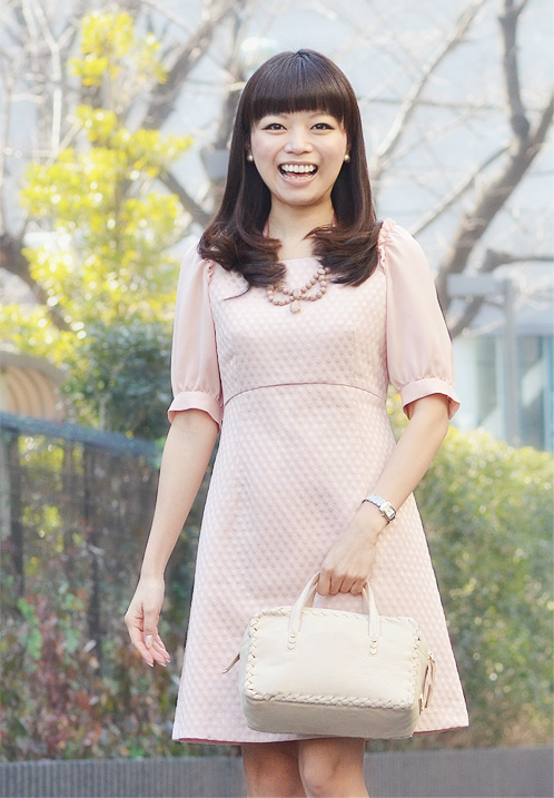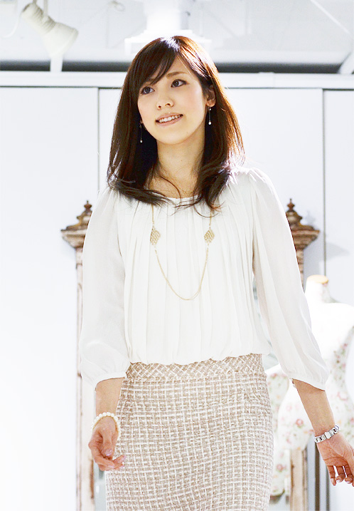 春らしいパステルカラーは品がよくレディな雰囲気。袖部分はシフォン素材なので、今はカーディガン合わせでも着やすく、本格的な春には、透け素材なのでほんのり肌見せで女性らしく。トレンドのボリュームアクセサリーと合わせてより華やかに。
