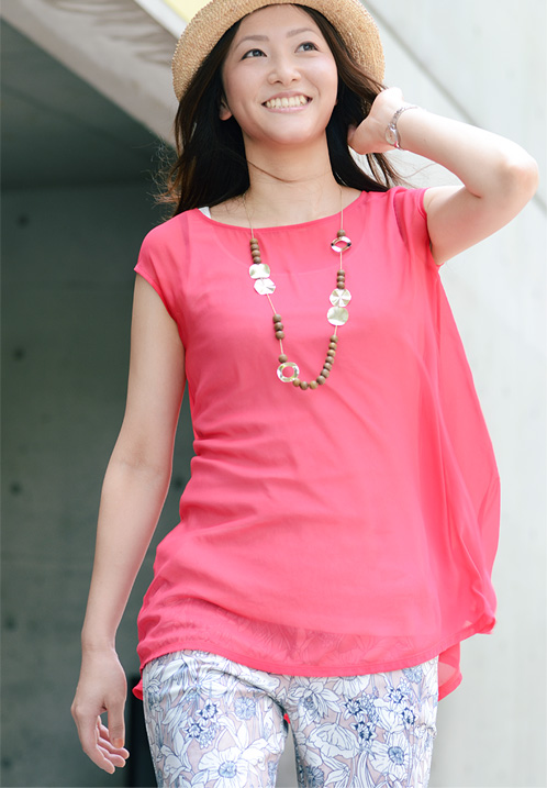 Aラインに広がるシルエットが女性らしい雰囲気を演出するシフォンカットソーです。サラッとした質感は爽やかでしなやかなタッチ。発色性の高いポリエステル素材を使用し、キレイなカラーを実現しました。お洗濯をしてもシワになりにくく、お手入れも楽ちんです。