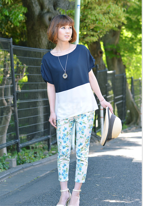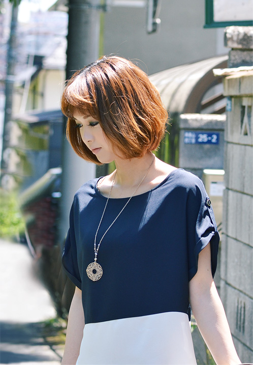バイカラーがレディな雰囲気のドルマンスリーブブラウス。シルクのような肌触りで着心地も滑らか。タイトなボトムス合わせがオススメ。