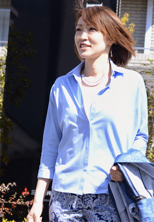 ゆるやかなシルエットでこなれて見えるシャツは、ノーカラーで大人っぽく!襟元に付いたたくさんのビジューで華やかさもプラスしました★パンツ・スカートどちらともスタイリングにも相性◎です!